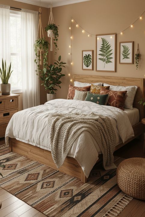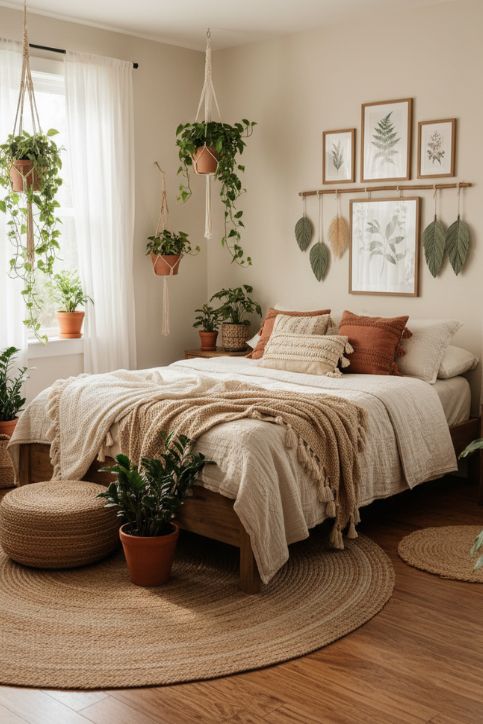 Create a warm, inviting bedroom with soft neutral bedding, cozy knit blankets, and layered pillows. Add potted greenery, hanging lights, and wall art to bring a natural, calming boho vibe into your space.