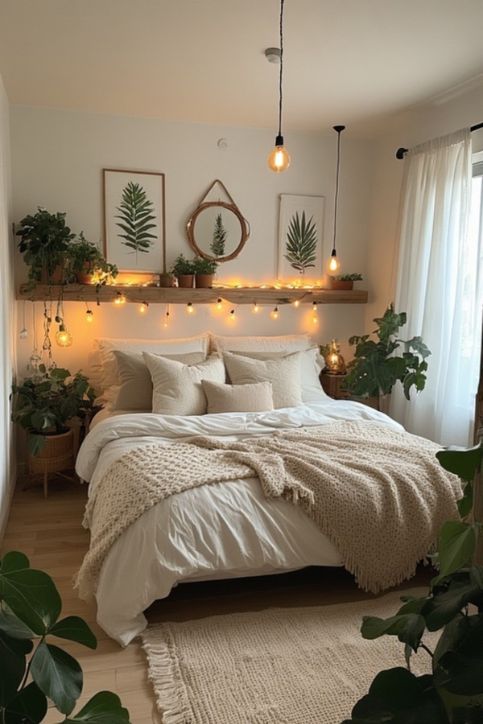 Transform your bedroom into a dreamy retreat with warm fairy lights cascading across the wall, layered bedding in soft neutrals, and touches of greenery. Add textured rugs and chic wall art for that cozy boho vibe.