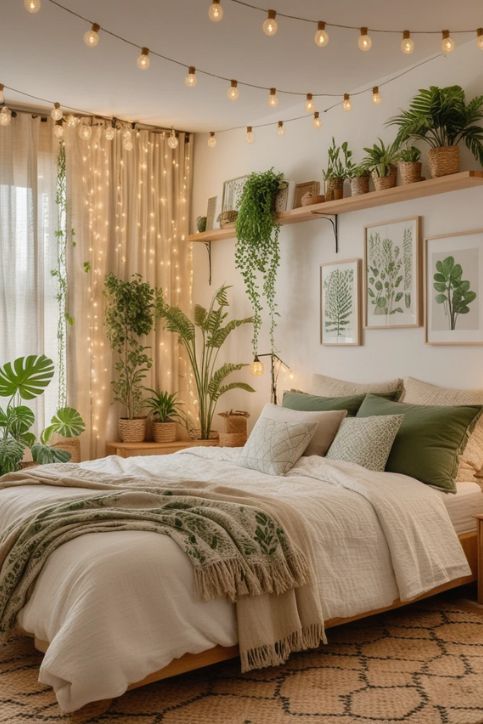 Create a warm and inviting bedroom by blending soft bedding, lush greenery, and string lights. Natural textures like wood and wicker add charm, while framed botanical art brings a calming, modern boho feel to your space.