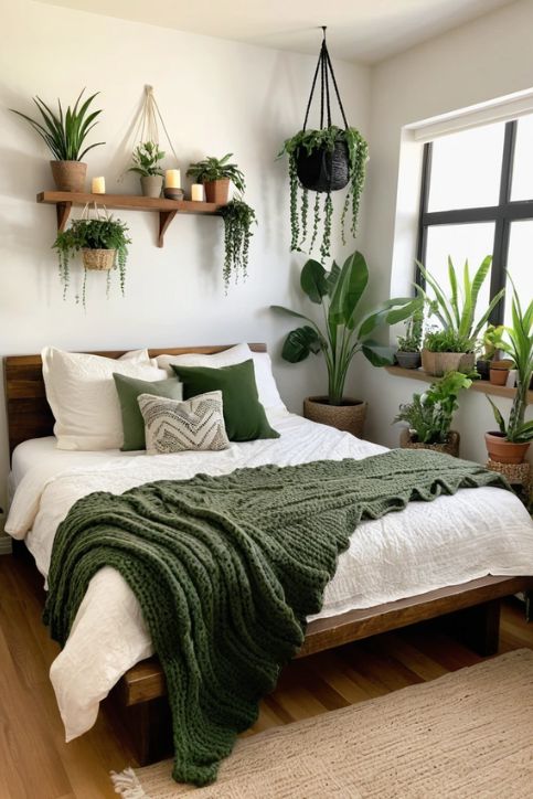 Design Tip: Layer plants in different ways—hang trailing vines, place leafy pots on shelves and the floor, and keep succulents on your nightstand. Pair greenery with natural wood, woven textures, and sheer curtains for airy light. Add warm lamps and botanical prints for a cozy, nature-inspired retreat.