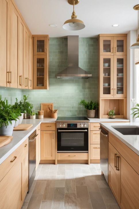 Pair natural wood cabinetry with soft, muted backsplash colors like mint or sage for a fresh vibe. Add under-cabinet lighting to brighten work areas and highlight details. Keep countertops minimal with a few plants or décor to maintain a clean, inviting look.