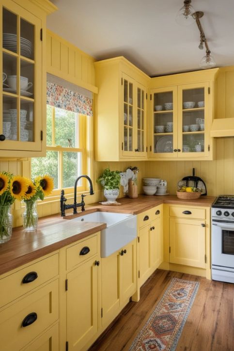 This cheerful farmhouse kitchen combines soft yellow cabinets, rustic wood countertops, and sunflower accents to create a bright, welcoming space. The farmhouse sink and open shelving make it both practical and stylish.