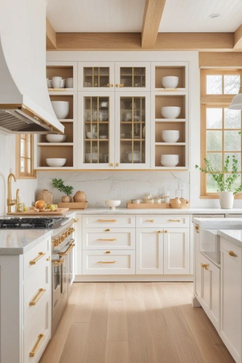 Keep your farmhouse kitchen bright and inviting by mixing neutral cabinetry with warm wood tones. Add open shelving to display simple white dishes, bring in greenery for freshness, and choose gold or brass hardware for a refined touch that balances rustic and modern styles.