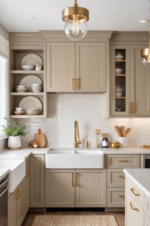 This modern kitchen combines taupe cabinets, white quartz countertops, and gold hardware for a timeless yet stylish look. With subway tile backsplash and warm oak flooring, it creates a cozy, elegant, and inviting space perfect for everyday living.