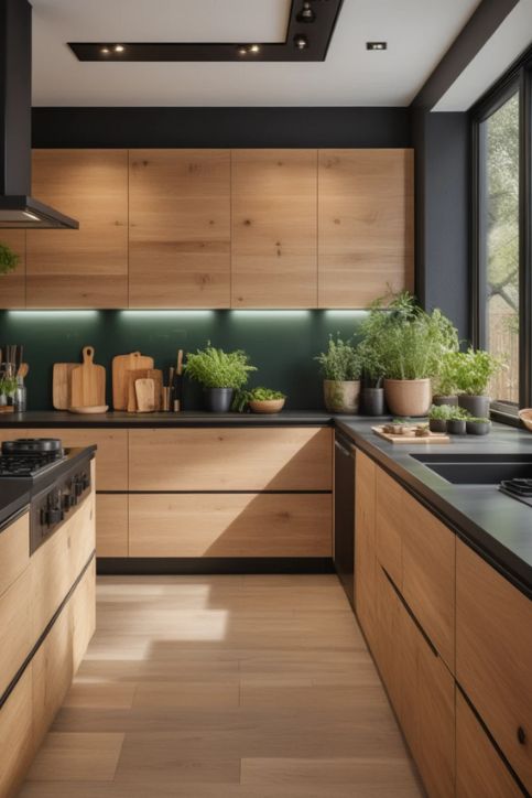 Use large windows to bring in natural light and highlight the richness of wooden cabinetry. Pair with matte black accents for contrast, and decorate with fresh herbs or potted plants to soften the modern look while keeping the kitchen lively and fresh.