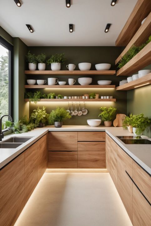 Use layered lighting—combine natural daylight with soft LED strips under cabinets and shelves. Pair rich wood cabinetry with neutral stone countertops for balance. Add potted herbs or small greenery to bring life and freshness, making your kitchen warm, functional, and inviting.