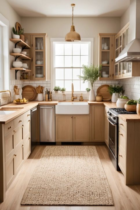 Mixing white and wood cabinetry is a smart way to bring warmth while keeping the kitchen light and open. Add gold hardware for a modern touch, and style with simple greenery, woven baskets, and a soft rug to balance function and coziness.