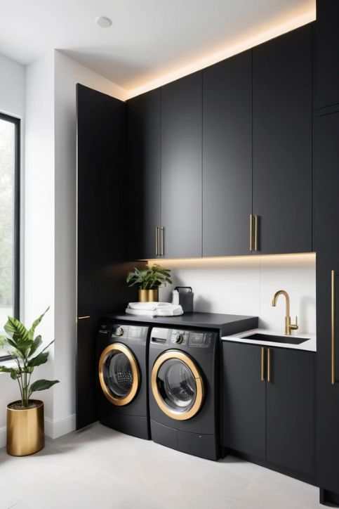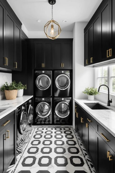 Create a striking modern laundry room using a bold monochrome palette. Black cabinets, white marble counters, and chrome accents deliver timeless sophistication and high-impact visual contrast.