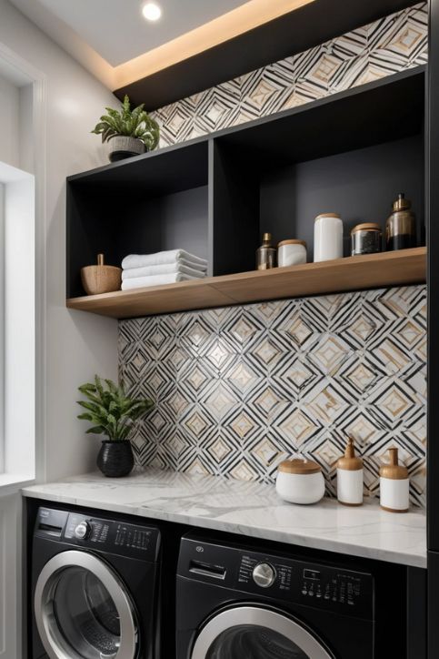 Incorporate a geometric designer tile backsplash behind the sink or along the entire wall. The pattern adds depth, texture, and a luxurious modern feel that transforms a basic utility room into a stylish showpiece.