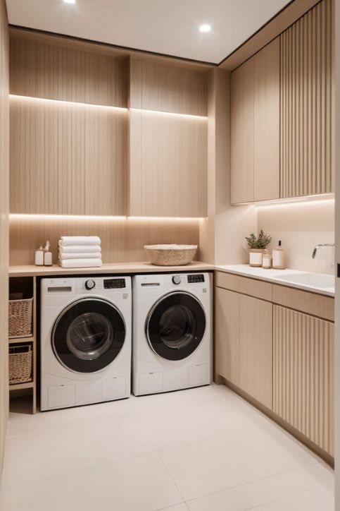 Conceal your laundry appliances behind custom sliding doors for a clean, polished modern look. This creates a serene, spa-like space where form meets function without visual clutter.