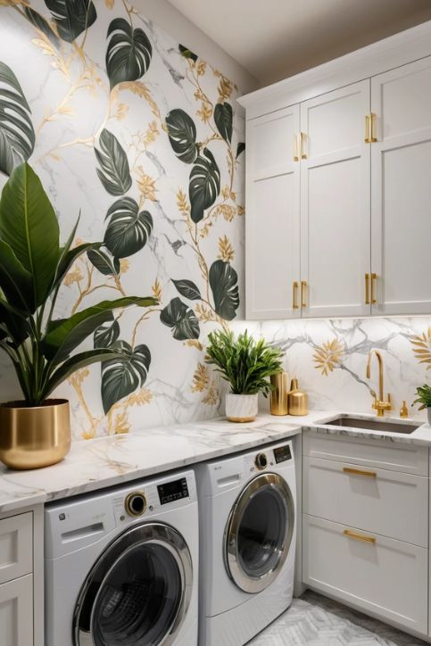 Create a striking visual moment by adding a luxury wallpaper feature wall in botanical, metallic, or marble patterns. The right print makes your modern laundry room feel custom-designed and photo-ready.