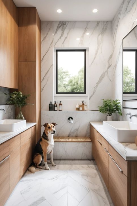 Add a built-in pet-wash station tiled in luxurious stone or marble. It’s functional, visually stunning, and instantly elevates your laundry room into a multi-purpose space with designer flair.
