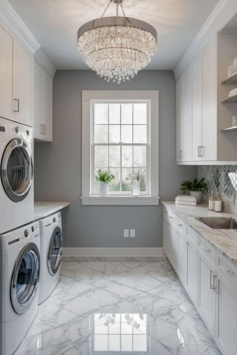 Transform your laundry room decor with a dramatic chandelier or oversized glass pendant light. This instantly adds luxury and creates an unexpected focal point that makes even routine chores feel glamorous.