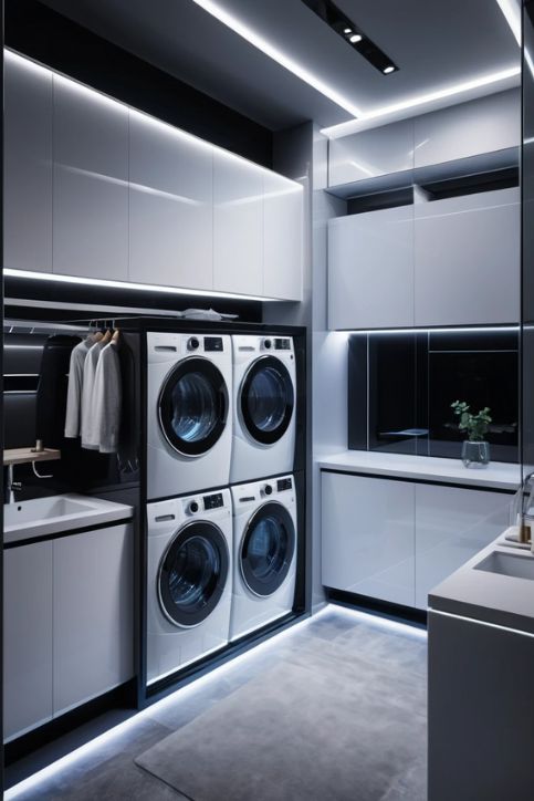 Elevate your laundry room with a smart home panel featuring digital controls, timers, and integrated lighting. This tech-forward upgrade blends luxury convenience with ultra-modern design.