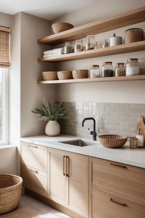Stage shelves with matching glass jars, woven baskets, and neutral-toned towels. Keep décor minimal for a high-end editorial look. Natural wood photographs beautifully in soft daylight settings.