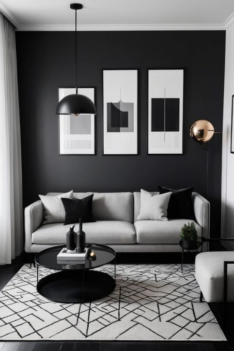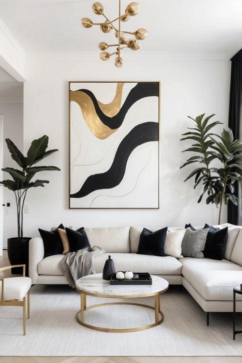Mix glossy and matte finishes to create depth without adding color clutter. Try a black-and-white rug, matte black lamps, or chrome side tables. Add a single greenery accent to break the monotone subtly while keeping that luxury edge.