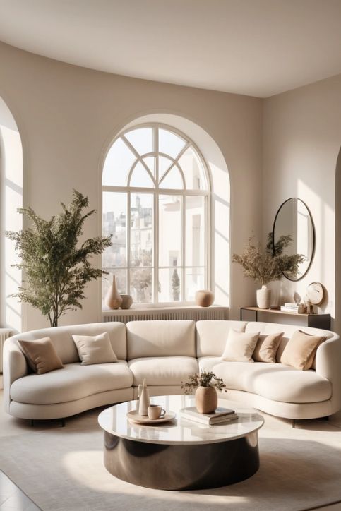 Break the monotony of straight lines with gentle curves. Rounded coffee tables, arched mirrors, and curved sofas bring an inviting, modern-luxury touch to minimalist interiors.