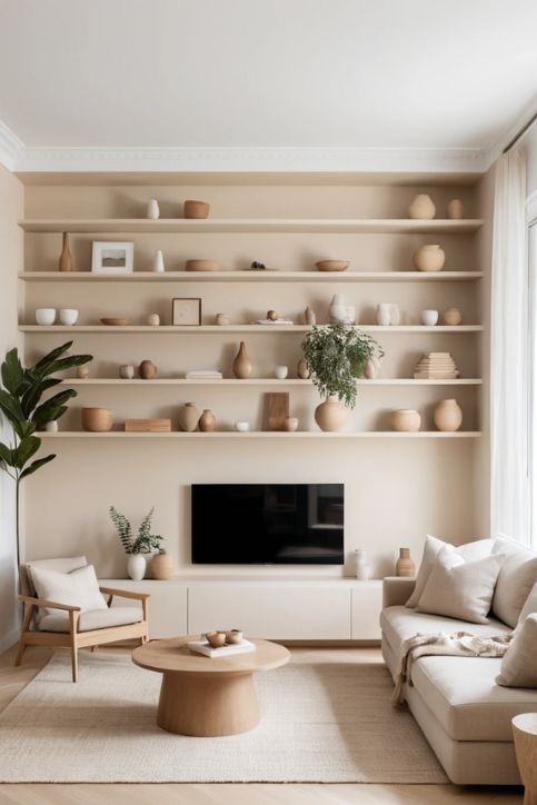 Minimalism means “everything has its place.” Floating shelves or built-in cabinets offer sleek display areas while keeping clutter out of sight.