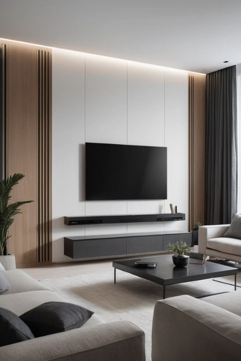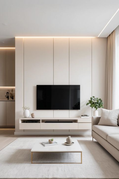 Choose minimalist pieces in neutral tones with clean lines. Floating media consoles or legged furniture lift the room, making it appear larger and airier. Add an LED strip under the console for a soft luxury glow — sleek, stylish, and functional!