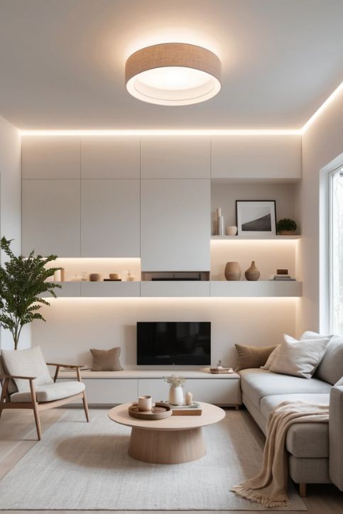 Combine recessed ceiling lights, a statement floor lamp, and hidden LED strips under shelves. Use warm white tones for a cozy yet modern glow. Lighting defines your minimalist space, turning simplicity into sophistication instantly.