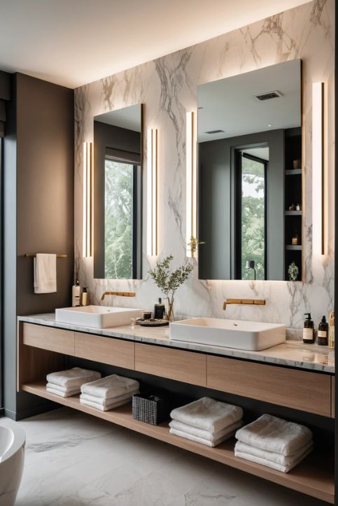 Use a long floating vanity with two vessel sinks or under-mount sinks. Add vertical LED sconces on both sides of each mirror. Keep the countertop marble or quartz for durability and elegance.