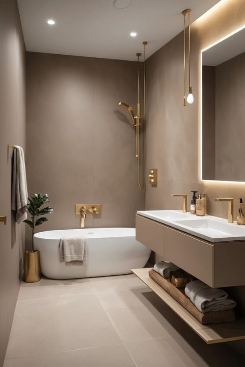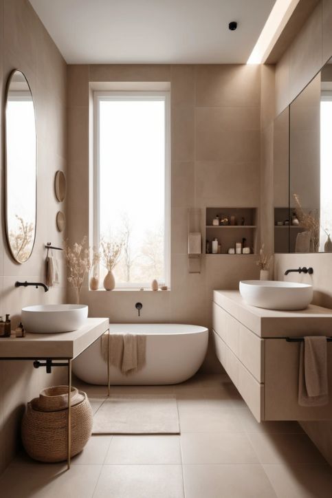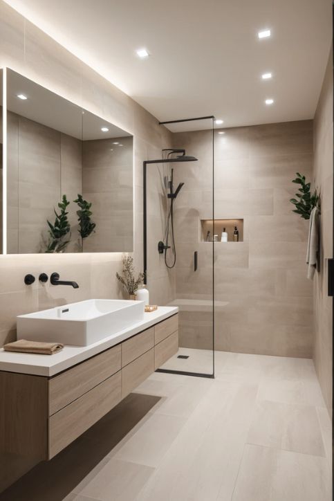 Covering walls with warm beige, taupe, or greige tiles creates a seamless and calming environment. This modern, Scandinavian-inspired approach makes bathrooms look bigger and more cohesive.