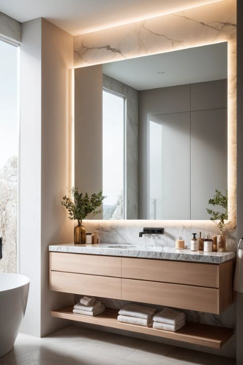 Instead of a single mirror, 2026 bathrooms are using full-length mirror walls for more light and openness. Backlighting enhances the glow and adds a luxury touch.