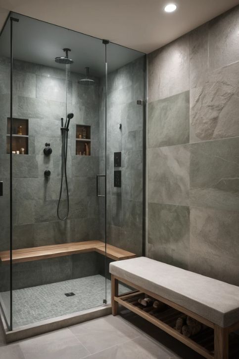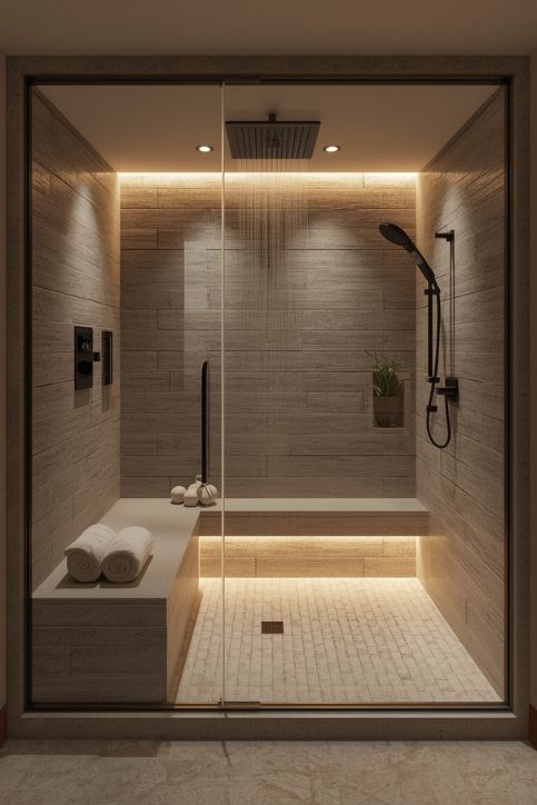 Choose textured stone or ribbed tiles for visual depth. Add a linear drain for a seamless floor look. Use warm LED lights inside the shower for a cozy vibe. Install dual shower heads — one rainfall, one handheld — for a complete luxury-and-function combo.