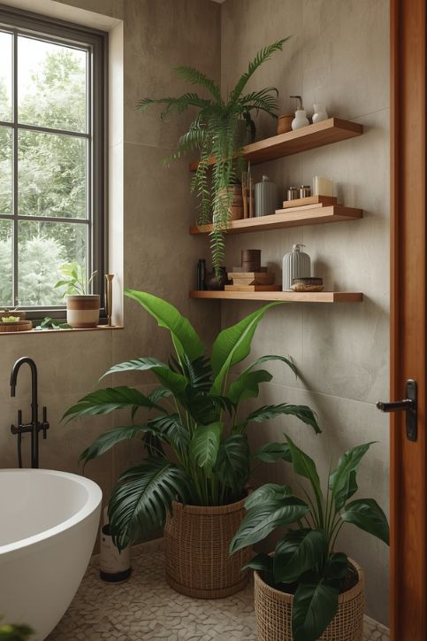 Place plants like pothos, fern, or snake plants near natural light. Use wooden bath mats, wicker baskets, or bamboo shelves. Mix greenery with warm beige tiles for a soothing organic-modern vibe.