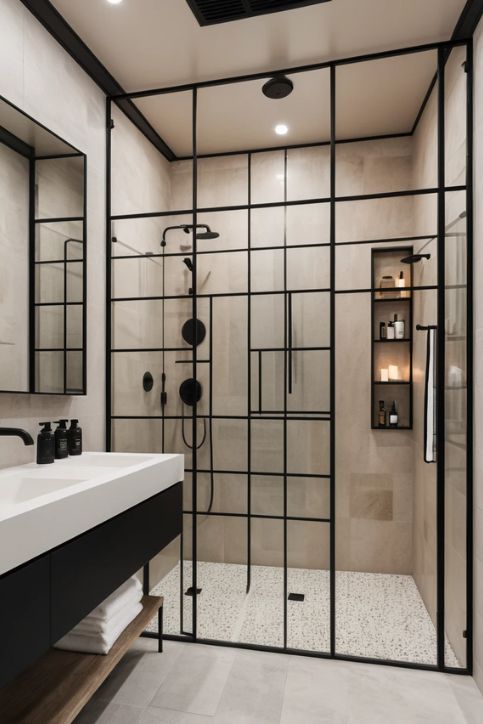 Grid-frame shower partitions add a modern industrial style without overwhelming the space. They provide structure, character, and uniqueness to minimal bathrooms.