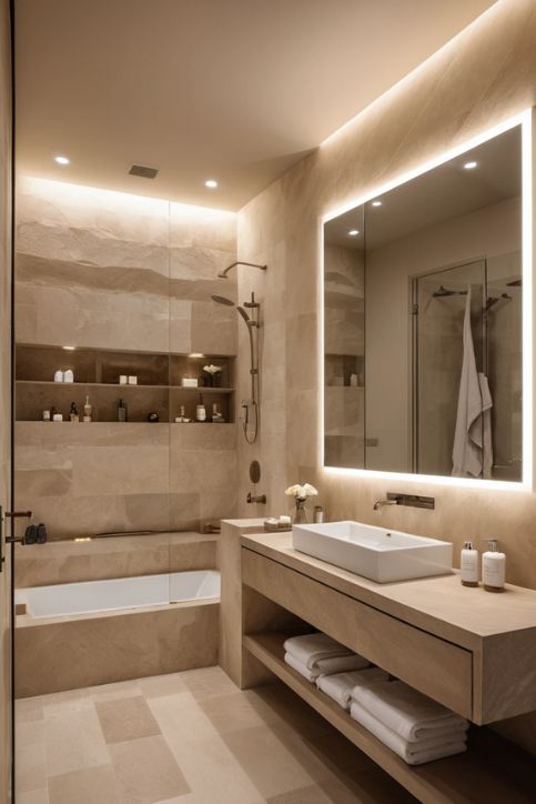 Layered lighting is trending—ceiling LEDs, under-vanity lights, wall sconces, shower LEDs. It creates multiple moods and makes the bathroom feel like a premium spa.