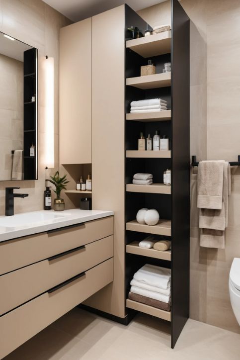 Use tall slim cabinets that reach the ceiling for maximum space. Add LED strip lighting inside shelves. Soft-close drawers and hidden compartments keep toiletries out of sight while maintaining a clean aesthetic.