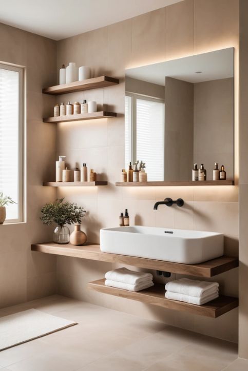 Use wood or matte laminate shelves that match the vanity for a cohesive look. Add soft LED backlighting under each shelf. Style with minimal decor—perfume bottles, rolled towels, small plants.