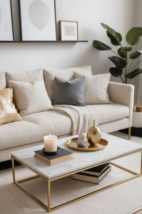 Stack 2–3 design books, a candle, and a small sculpture. Avoid overfilling—negative space is luxury. Try marble or glass tables to keep the area light and airy.