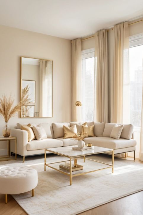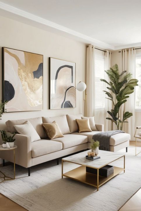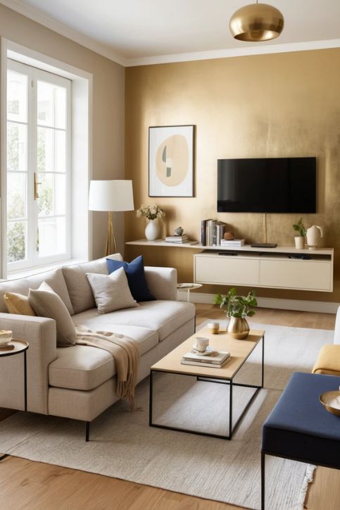 Brighten your small living room with soft neutral walls, beige or cream sofas, and metallic gold accents. This combo instantly opens up space while adding that modern luxe glow Pinterest loves.