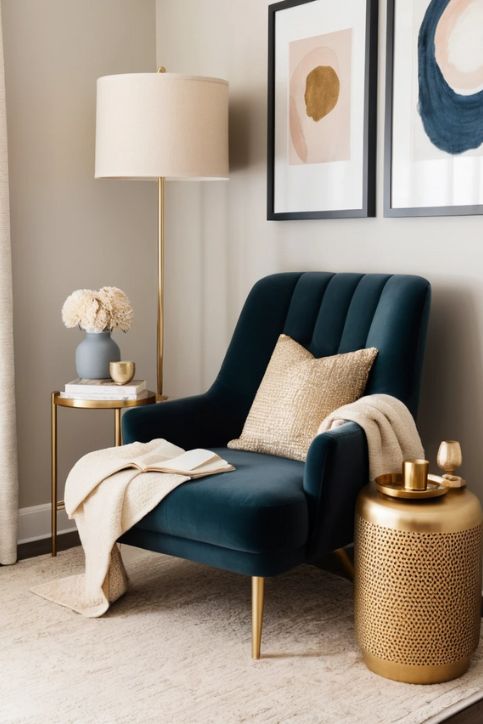 Choose a velvet or boucle chair in a bold tone—like forest green or cream. Add a gold floor lamp for mood lighting. Layer a small rug underneath to define the zone.