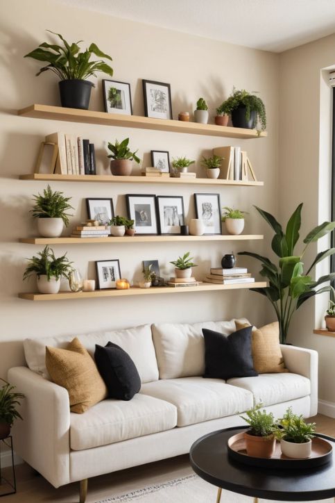 Stack three or four shelves in a vertical layout to save floor space. Mix books with greenery for balance. Choose brass or matte-black brackets to tie in with your modern theme. Great for renters too—minimal damage!