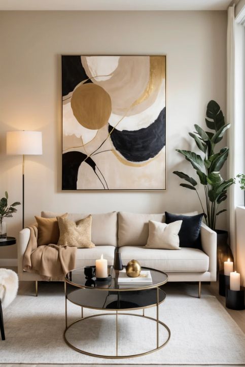 Choose abstract or minimalist prints in gold, beige, or black tones. Center it above the sofa to anchor the space. Use peel-and-stick hooks for renter-friendly decor.