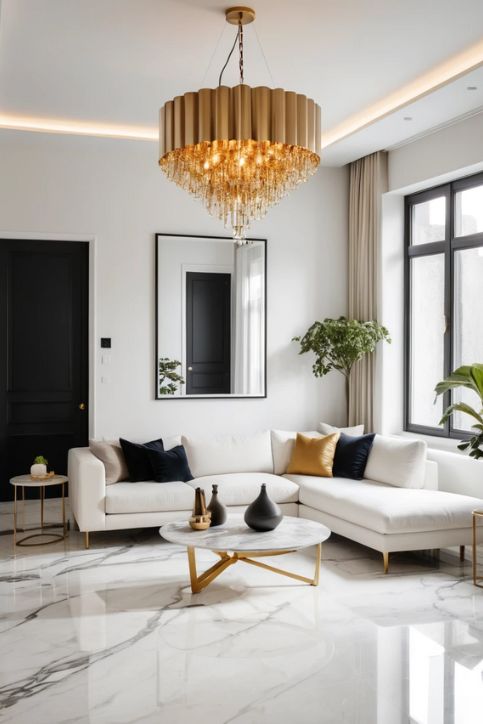 Use a light beige sectional, gold-framed mirror, and marble coffee table for that high-end vibe. Add warm LED lighting to enhance reflections and make your space feel larger. Try metallic trays or vases from Amazon Home for affordable glam.