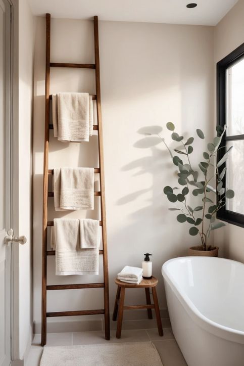 Choose a natural wood or matte black ladder for a modern winter aesthetic. Roll or softly fold towels for a layered, cozy look. Add one decorative element like a small eucalyptus bundle or a hanging woven basket for washcloth storage to complete the hotel-spa feel.
