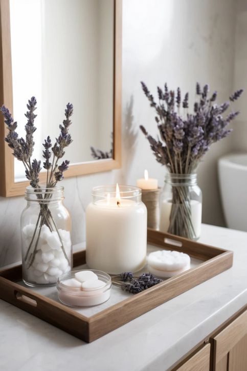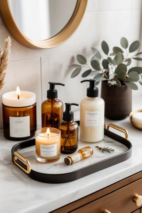 Stick to cohesive bottle colors—amber, black, frosted, or clear. One candle + one small plant = perfection. Any more = clutter.