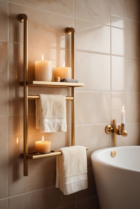 Choose a slim wall-mounted version. Place it near the shower and keep only 1–2 towels on it to avoid crowding. Neutral colored towels enhance the spa vibe.
