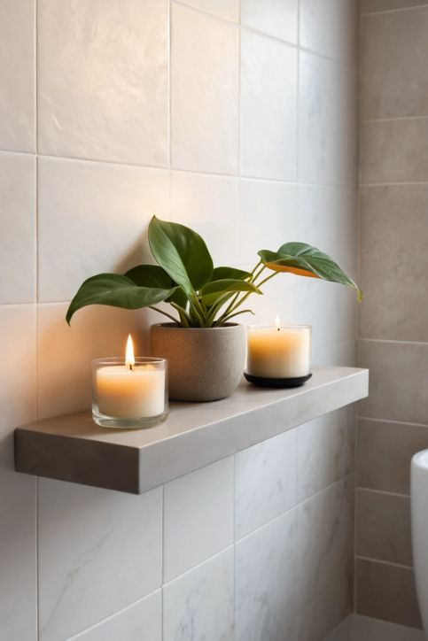 A small floating shelf can transform even a tiny bathroom into a winter sanctuary. Place a candle and a resilient plant like pothos or fern to add life.
