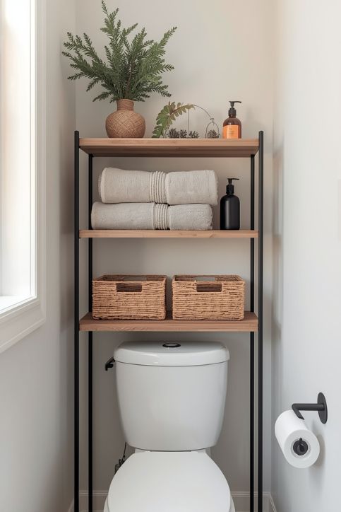 Choose a shelf color that matches your fixtures for a clean look—white, natural wood, or black. Style each shelf lightly—stacked towels, one decor item, one basket—to avoid clutter.