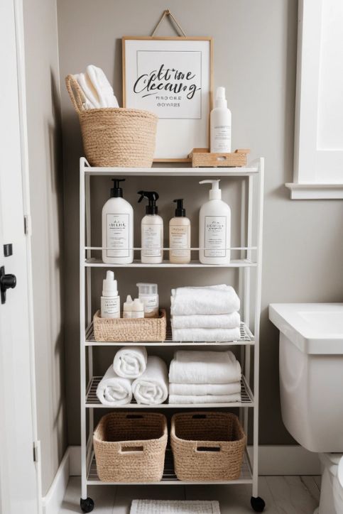 A narrow rolling organizer fits between the toilet and vanity or beside the shower. Store cleaning sprays, extra toilet paper, bath products, and haircare tools.