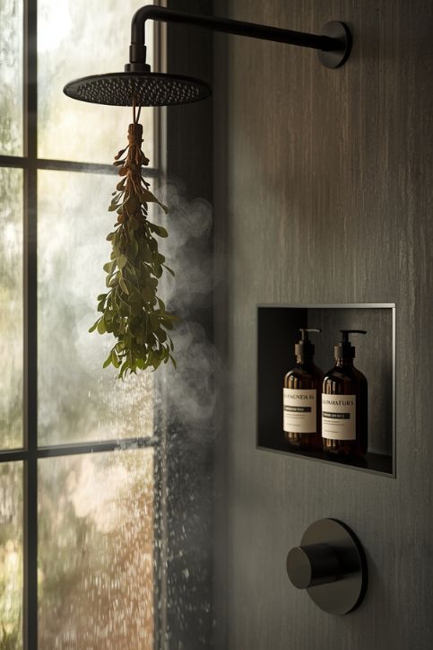 Keep only your winter scents in the shower to reduce chaos—think eucalyptus, cedar, vanilla, pine, or bergamot. Use a rust-proof caddy or corner shelf.